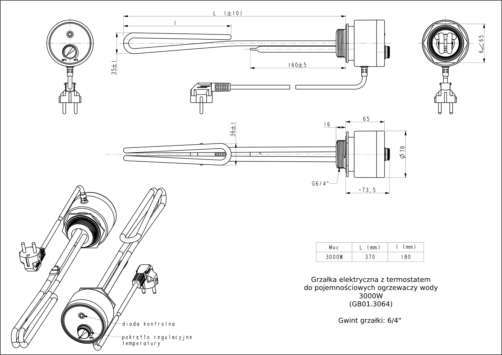 GRZAŁKA DO BOJLERA 3000W 6/4" Z TERMOREGULATOREM (GB01.3064G)